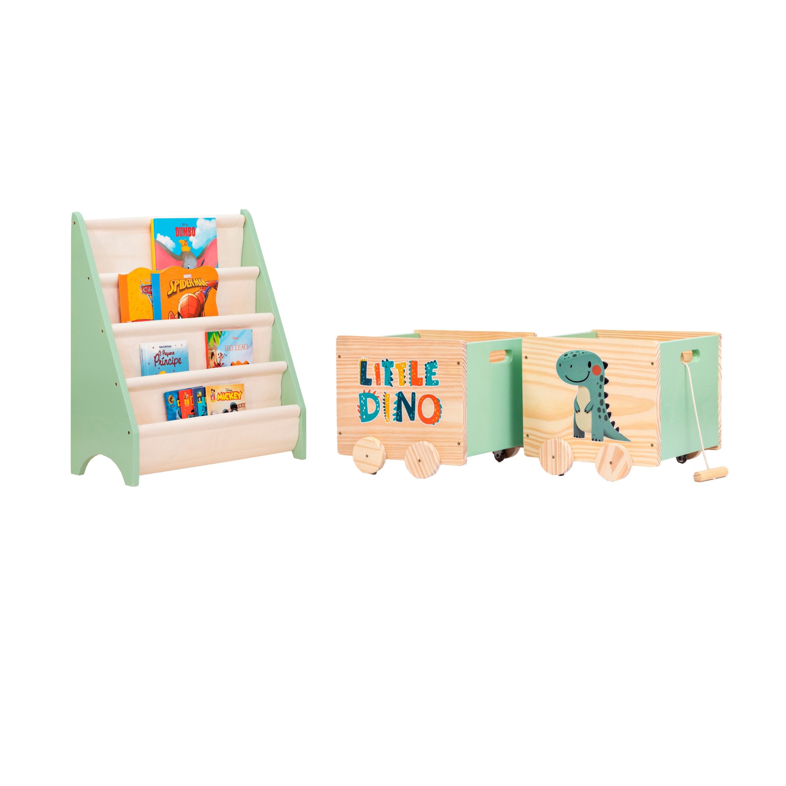 Feitas em madeira selecionada, as caixas são funcionais e seguras, com rodízios instalados e alças vazadas nas laterais que facilitam o transporte. Cada unidade acompanha um puxador de corda com alça de madeira, tornando o momento de guardar os brinquedos mais interativo. O acabamento parcial em tinta verde orgânico harmoniza com o rack, e a ilustração lúdica do “Pequeno Dinossauro” completa o visual do kit com charme e personalidade.